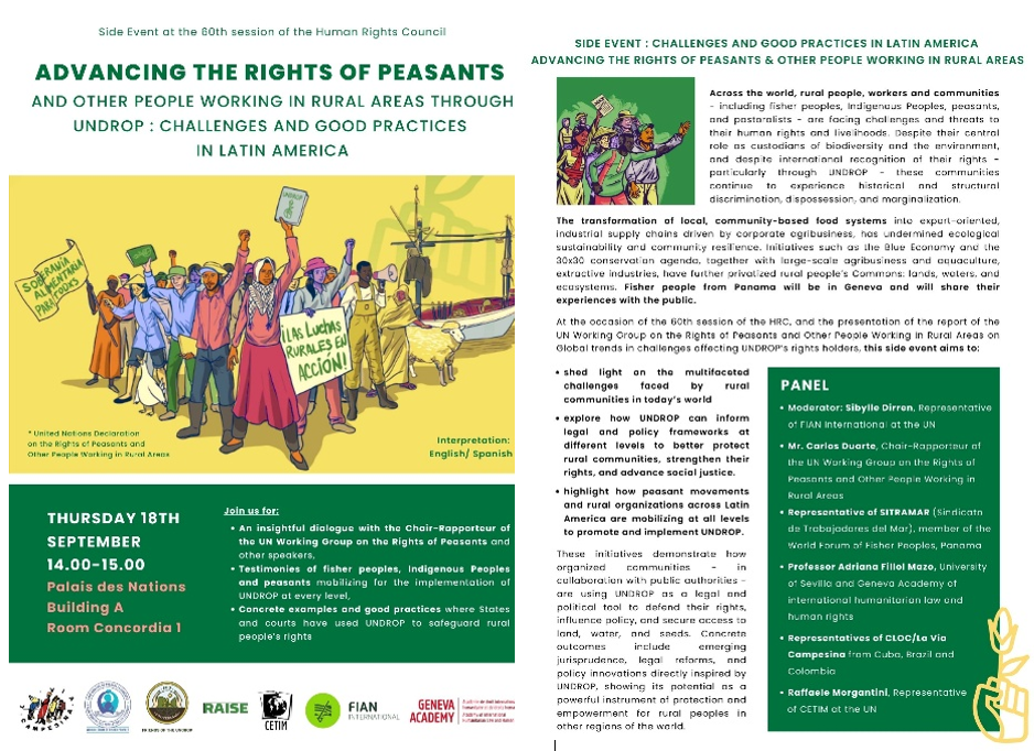 On 18 September 2025, on the occasion of the 60th session of the United Nations Human Rights Council, a parallel conference brought together actors committed to the protection of the rights of rural communities at the Palais des Nations in Geneva. Entitled “Advancing the rights of peasants and other people working in rural areas through UNDROP: challenges and good practices in Latin America”, the conference was co-organised by La Via Campesina, the World Forum of Fisher People and Fisher Workers (WFFP), FIAN International and CETIM, with the support of the Geneva Academy of Human Rights, RAISE and the Swiss coalition “Friends of the Declaration”, this conference was an opportunity to discuss major issues and innovative initiatives with rural movements and States committed to the rights of rural peoples in Latin America.